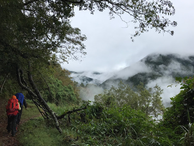 因山屋外原本設置的廁所已被風吹倒(殘骸還在原地),在尋找其他稍微隱蔽的地點的同時,發現上面這張照片的右側山坡上有非常驚人的景色,從來沒看過的,如此驚人的小白花海(衛生紙),還有整陀的白飯在地上,就在步道旁.