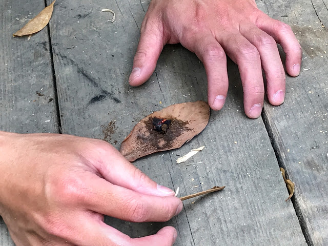 取火的方式有很多種,利用打火石、鎂棒,或是手鑽、弓鑽⋯等.這次是學習弓鑽取火的方式,據說比手鑽容易,有機會再慢慢親自求證.