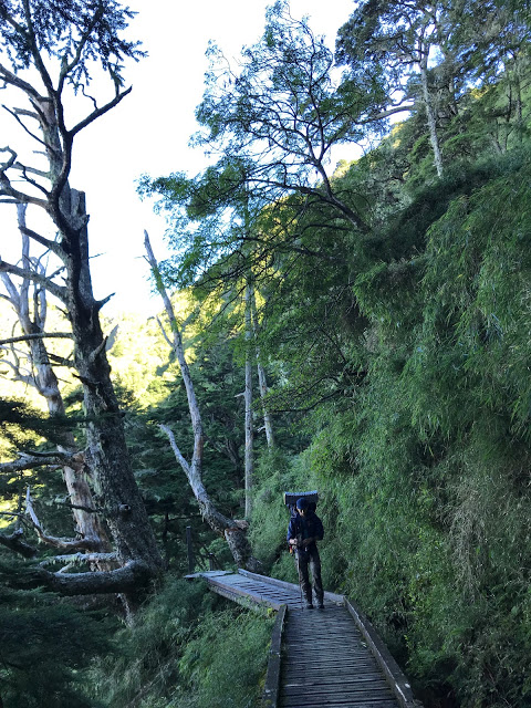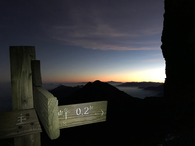 因不想原路來回圓峰山屋,所以一大清早摸黑收帳,重裝回主南岔路口丟包,再輕裝來回玉山北峰.原本山友大哥建議我們另一條路線(直接走稜線到主峰),不過礙於重裝又摸黑的關係,還是選擇走原路比較安全一些.