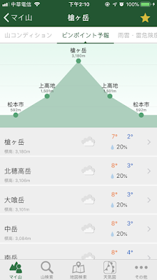 日本氣象協會出的日本山頂天氣查詢APP,提供第一個月免費試用,可以查詢攀登地點登山口、沿途經過地點及山頂天氣,並用ABC分級當日天候是否適合攀登(A代表天氣好適合爬山,C代表風大雨大天候不佳),日本登山必備.