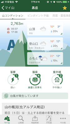 另一個查詢天氣的網站,由日本氣象株式會社提供,免費.選擇行樂地天氣即可查詢各山區氣溫、風速、降水量、登山天氣分級,舉例: 槍岳天氣