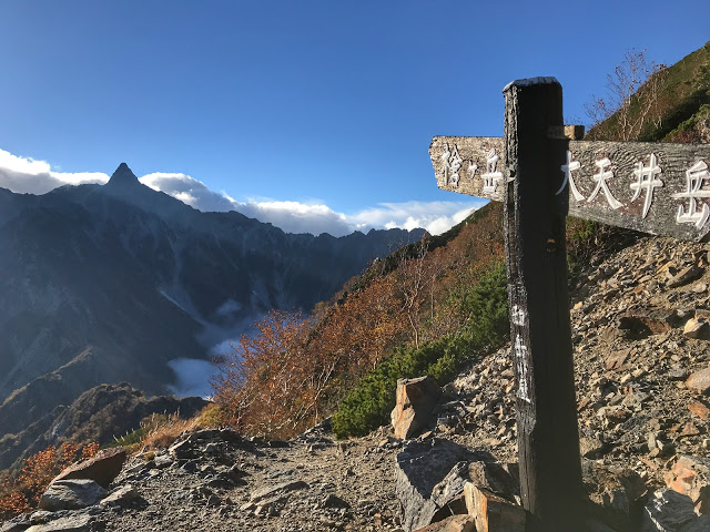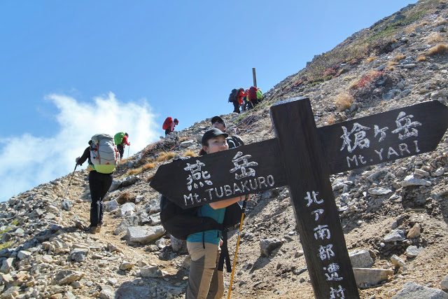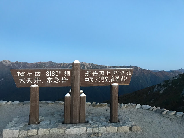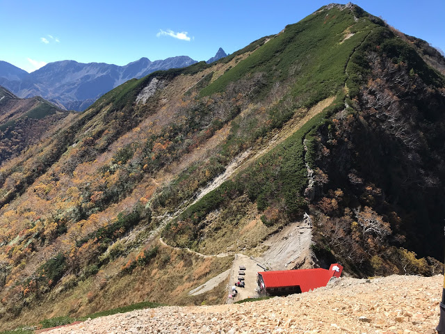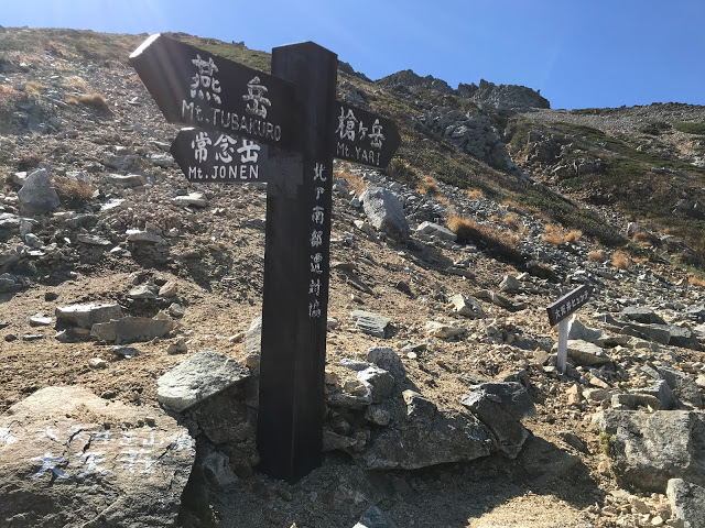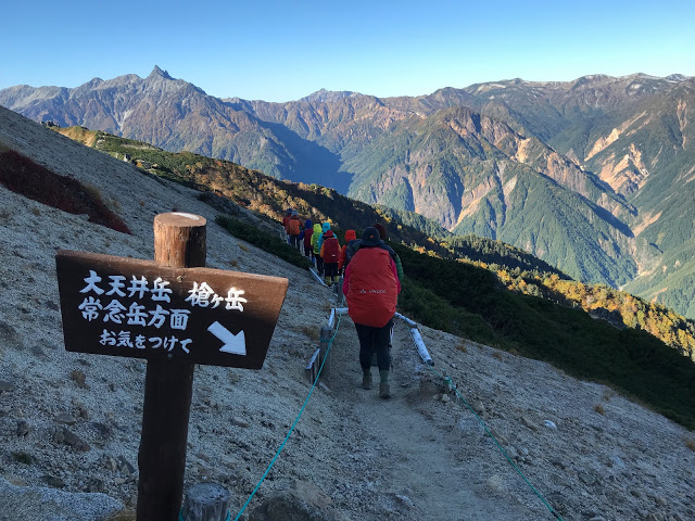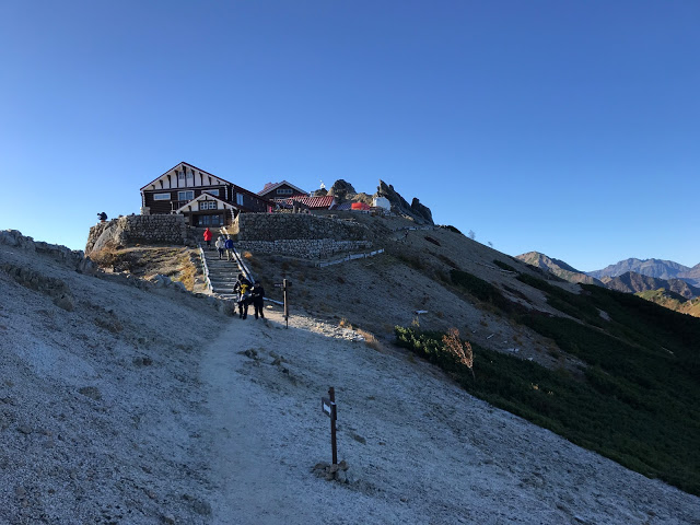 抵達大天井ヒュッテ前,看到對面的上坡路有點緊張,往上的路是通往牛首展望台(來回大約30分鐘),我們則是要走下方的喜作新道,通往西岳.確認吃飽飯後不用繼續爬坡,這一餐吃的特別放鬆.