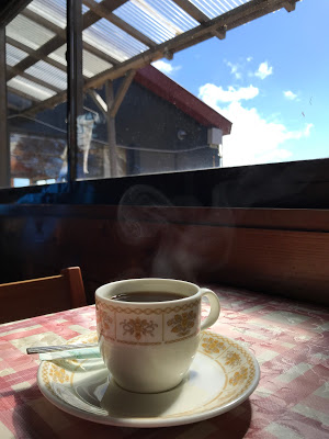 早上6:15返回燕山莊整裝後,還有一點時間可以偷閒,跑到餐廳點了一杯咖啡,才覺得甘心離開.心理默默許願,希望未來哪一天可以帶著爸爸媽媽一起,再來走一趟燕岳.