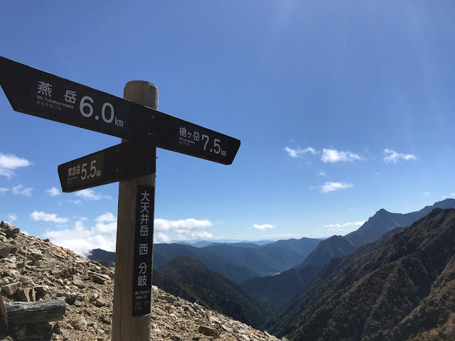 抵達大天井ヒュッテ前,看到對面的上坡路有點緊張,往上的路是通往牛首展望台(來回大約30分鐘),我們則是要走下方的喜作新道,通往西岳.確認吃飽飯後不用繼續爬坡,這一餐吃的特別放鬆.