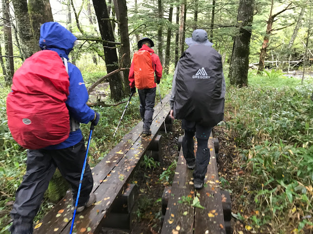 吃完早餐後7:00am出發最後一天的縱走行程.查詢氣象的結果顯示天氣會在9:00am後轉晴,一踏出明神館,再度感受到日本氣象預報200%的準確度,乖乖的穿上雨衣.今天路途將近8小時的漫漫長路,先撐過這2小時吧.