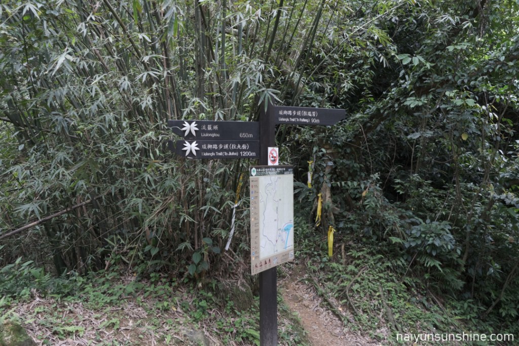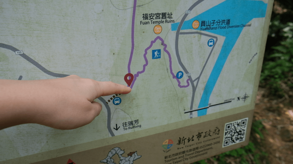 有兩個方向可以往瑞芳,一個是往福安宮舊址(左轉),一個是琉榔路步道(直行).淡蘭北路的路線是走福安宮舊址(上圖紫色路線),還要再走最後一小段步道.
