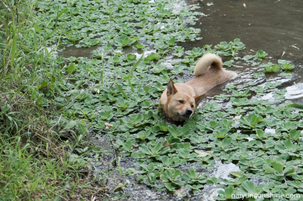 狗狗走一走突然在一個轉彎處不見了,竟然跑去泡在池塘裡涼快!