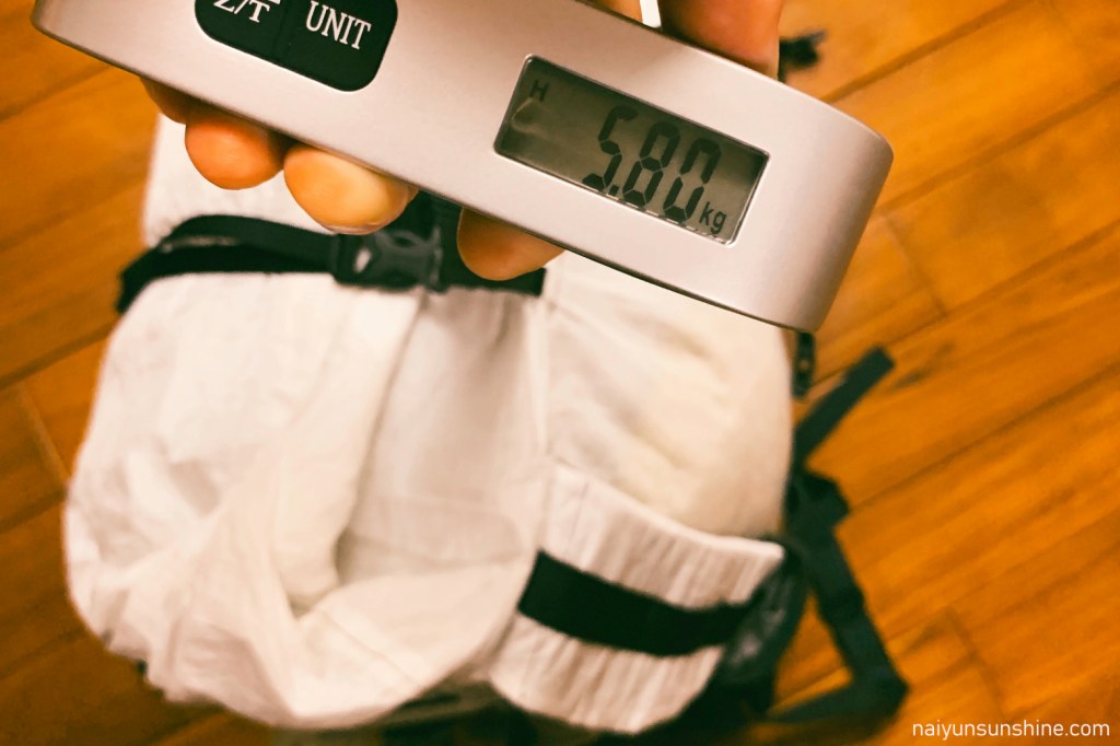 出發前很臨時的打包,5.8kg含2天食物,不含水.