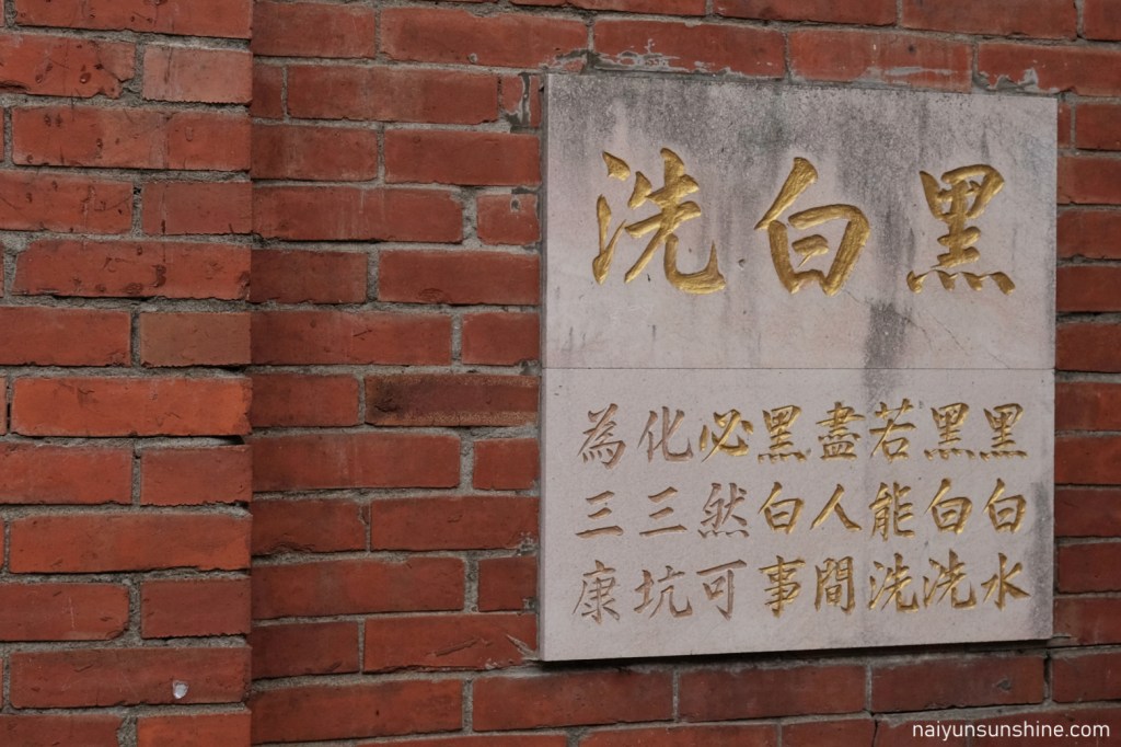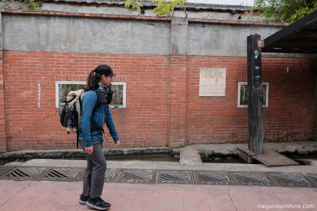 首先經過位於老街入口的黑白洗,是以前居民洗滌衣物的地方。關於黑白洗的名稱有兩種說法,第一種說法是這裡的水源有兩處,一是清澈的石門大圳,二是較為混濁的野溪;另一種說法則是因為這裡什麼都有人洗,像是洗蔬菜、洗衣服、洗農具…等.